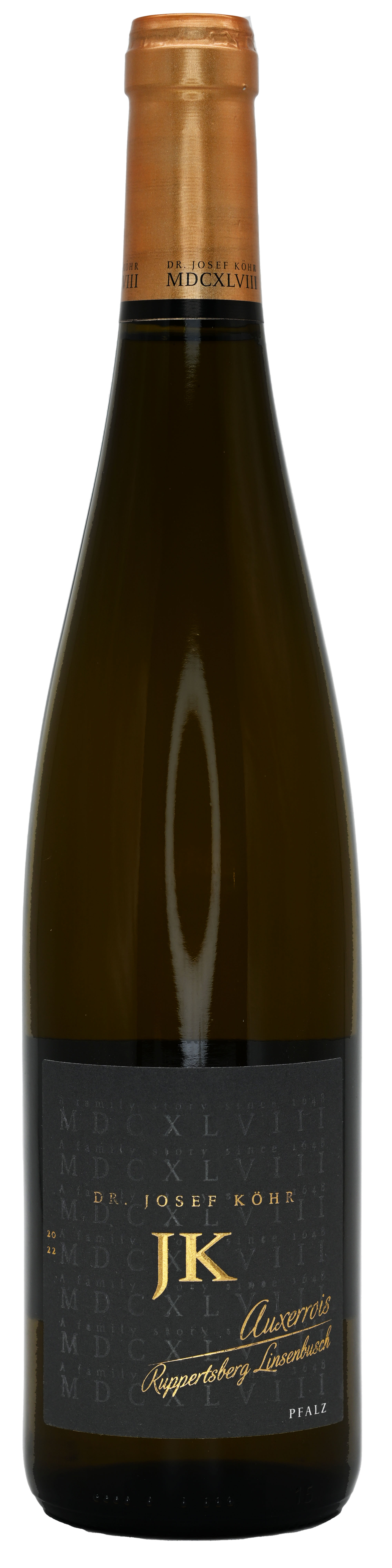 Ein vielschichtiger Weißwein der Traditionssorte Auxerrois. Durch konsequente Ertragsreduktion und Selektion, sowie den Ausbau im 600l-Halbstückfass, entfaltet dieser Wein nicht nur in der Nase, sondern insbesondere am Gaumen ein fulminantes Spiel kräftiger Rebsortenaromatik, wie reifer Quitte und Birne, sowie wohl dosierte Avancen von Walnuss und Caramel. Der besondere Stil dieses Weins macht ihn zu einem herausragenden Essensbegleiter, wie zum Beispiel aromatische Hauptspeisen mit kräftigem Gorgonzola, oder gebackenem Lachs. Dieser Weißwein ist mit einem hochwertigen Naturkork verschossen, der eine Reifung auf der Flasche über lange Zeit ermöglicht.